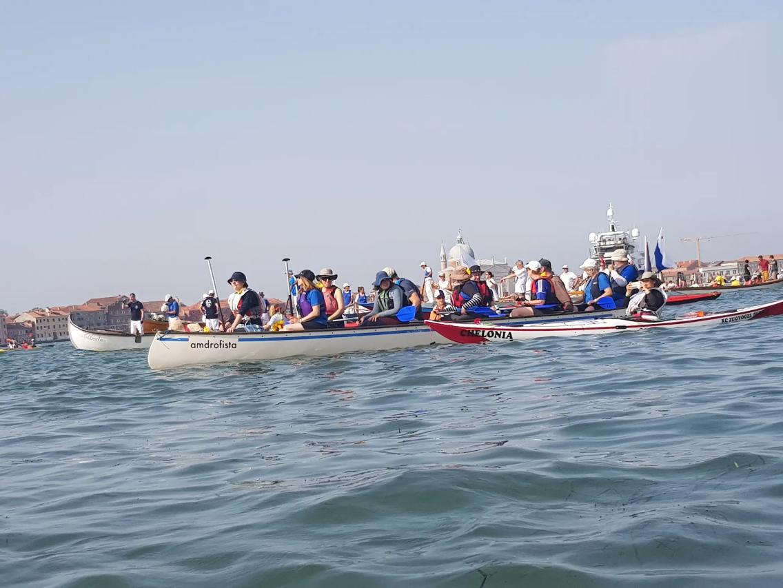 In diesem Jahr traf sich ein wahrer Vogelzug zu Pfingsten in Venedig. 32 Zugvögel in 17 Booten plus familiärer Support erkundeten teilweise vor und nach dem Pfingstwochenende die Laguna di Venezia, um sich gemeinsam mit 2000 anderen Booten und 7500 Teilnehmern am Pfingstsonntag auf die 30 km lange 46. Vogalonga zu begeben. Für reichliches Warmpaddeln sorgten die Lage des schönen Campingplatzes in Punta Sabbioni/Cavalino und für die Hüftlockerung beim abschließenden Austrudeln wurden um 15.00 Uhr alle motorisierten Verkehrsmittel gleichzeitig in die Lagune geschickt. Alle Zugvögel haben die Herausforderungen der Tour bestanden und sicherlich einige unvergessliche Erinnerungen an Venezia la Serenissima mitgenommen.