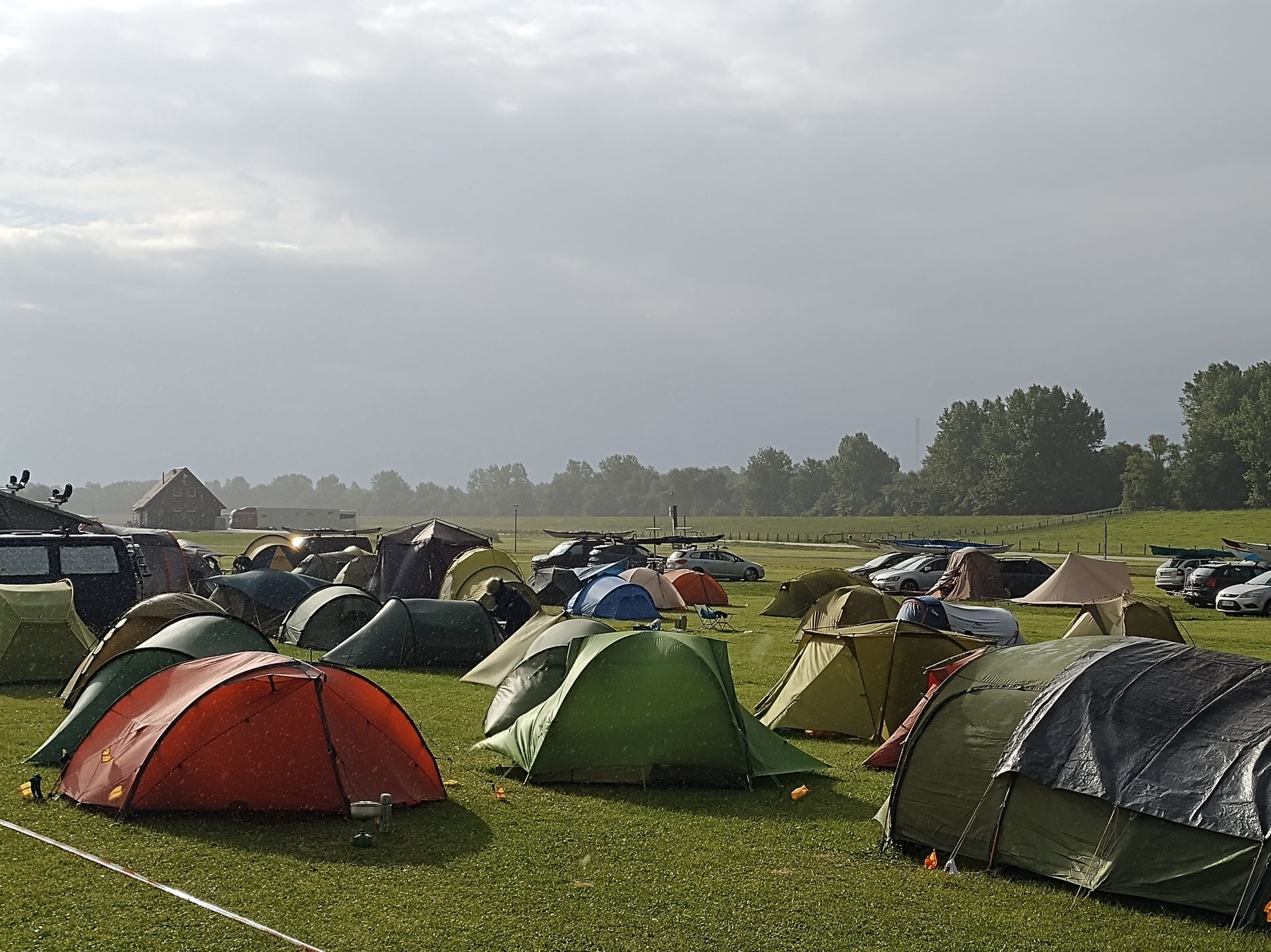 Weniger großartig war das Wetter – nach einem durchwachsenen Start folgten Schauer, dann Dauerregen, dann Starkregenschauer. Auf der Zeltwiese kam Wacken-Feeling auf, samt wachsender Pfützen unter und in den Zelten, allgemeiner Verschlammung und Trecker-Einsätzen zum Freischleppen festgefahrener Autos. Dazu war für zwei von drei geplanten Tourentagen konstant Fünfer- bis Sechserwind angesagt. Mehrere Teilnehmerinnen reisten frühzeitig ab.