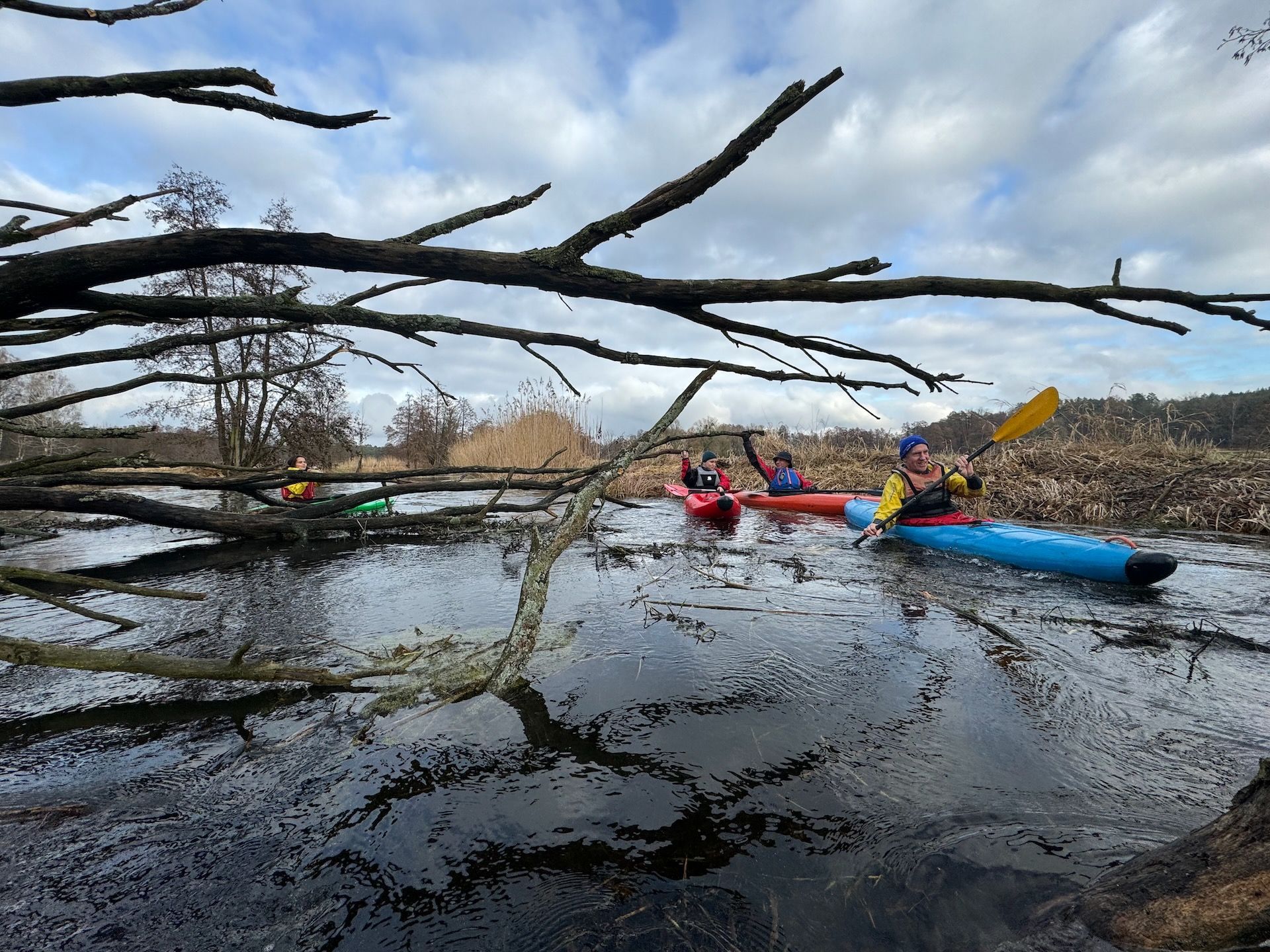 Dank der ausgiebigen Regenfälle in diesem Winter war der Wasserstand recht hoch, und die Saale hatte eine nette Strömung von geschätzt 4-8 km/h. Es gab im Verlauf der Tour dann auch einige Stellen, an denen man aufpassen musste, beispielsweise wo sich Treibgut an Brückenpfeilern angesammelt hatte oder auch an einem abzweigenden Wehr, das über den Großteil seiner Breite mit Baumstämmen versperrt war. Auf den freien restlichen zehn Metern des Wehrs erwartete Paddler*innen, die nicht brav am anderen Ufer blieben, ein reißender Strom. Ob und wie viele Paddler*innen dieser Strom verschluckt hat, ist nicht überliefert. Sah jedenfalls beeindruckend aus!